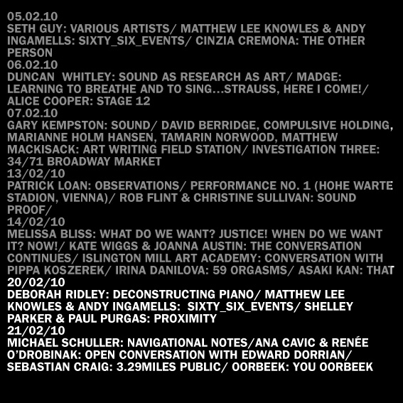 January 21st 2010 00:00 23:59 six_events in 2008 was performed by hundreds in 29 countries across the globe over 6 days sixty_six_events was over a full 24 hour period and could be performed by anyone, anywhere. You were asked to Read. Respond. Relax. Repeat. And freely interpret and perform any number of the 66 events within the given time. Actions were documented and sent via twitter/facebook/myspace/youtube to info@sixtysixevents.com. For Field Recordings a presentation of the documentation by composers Matthew Lee Knowles & Andy Ingamells will be shown.