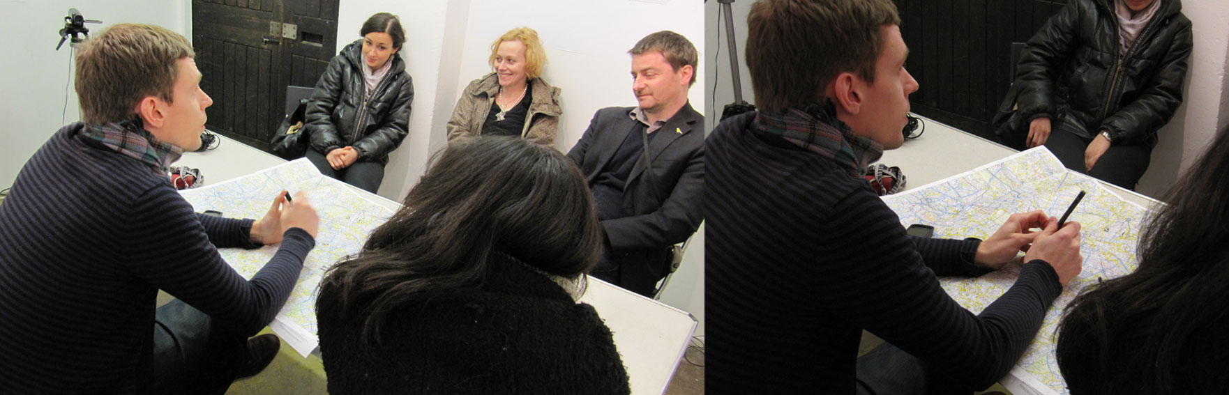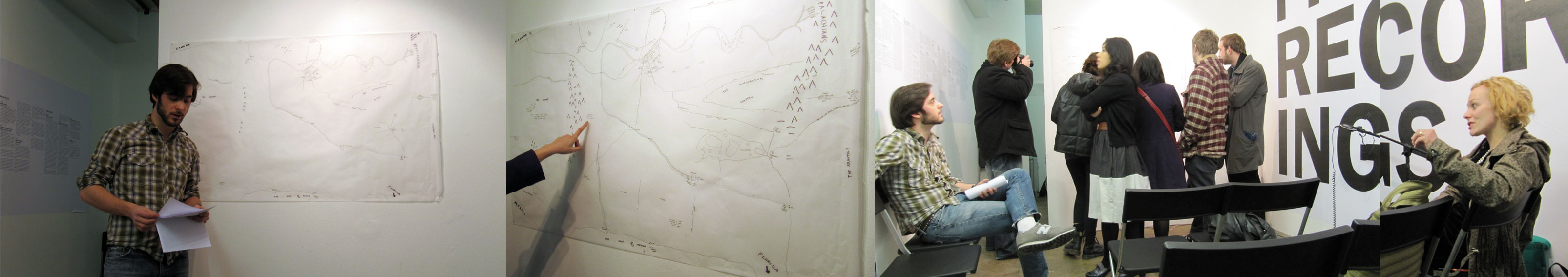 The idea behind Navigational notes is an extension of a body of work that has taken several forms in the course of its development performance, installation, writing, drawings and would here be reduced to its most essential form, the information recorded as the result of travel. Starting from the basis of psychogeography, my interest lies in the exploration of the link between our sense of place and our self-identity and how the two inform each other as one or both of these senses shifts dramatically. Practically, the work consists of the act of navigation through the drawing of a map (returning to the ‘field,’ if you will, psychologically rather than physically). Parts of the map can and do have their basis in reality: places visited, remembered, some well known, others less so. The connection between these places is less real streets and rivers thousands of miles apart might flow into each other, disparate cities might merge all the result of how memory and experience alter the way one looks at not only their place in the world, but in how the world itself is shaped. Accompanying the drawing of the map is the making of notes aloud, talking about what is being drawn, how it connects; the memories and anecdotes that inform the drawing are in turn infomed by it. As I talk and draw I form what constitutes two maps, one spatial (recorded on paper), one spoken (recorded as audio). Each has the potential, perhaps, to function on its own, but provide even more when presented together as documentation. In that form, without the performer as a guide, the viewer is left to their own devices with the recording and the map, each useful in navigating the other, each the result of an experience navigating through remembered territory. (I think there is a distinction to be made here between the navigation of phsycial and psycological geography, each having its own merits, each equally as expeditionary. To couch it in the header of the project, the recordings and notes one makes in the field of one’s mind can be equally as informative in terms of a sense of identity and understanding as the information recorded literally and physically in the field of a geographic place can be informative of the place as a whole.) The map would be drawn on a single large sheet of paper (its size determined in part by the dimensions of the space; it could be made on the wall or on the floor, preferrably as large as practically possible, up to approx. 50ft.2) with the audio recorded on a handheld device (to simplify setup and enable louder, clearer sound without having to worry about background noise).