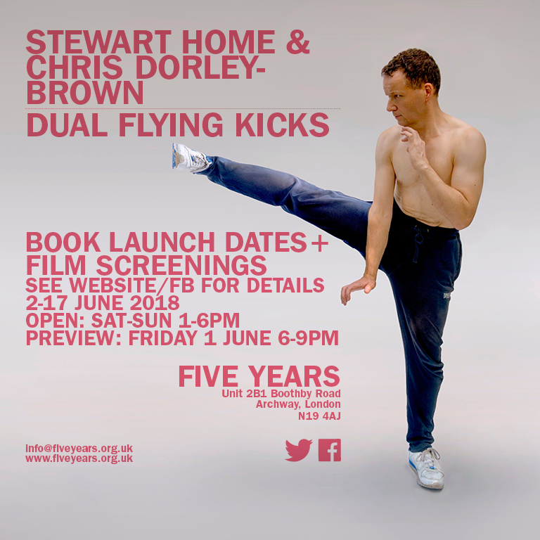 Dual Flying Kicks is an exhibition by artist and author Stewart Home and photographer Chris Dorley-Brown. The collaborative works include a series of morphs where Dorley-Brown has photographed Home imitating pictures of a witch incarnating the triple goddess in her maiden form. Home and this Spanish but London based witch are merged to create a series entitled Occult Androgyny. In another work, Dual Flying Kicks, Dorley-Brown has photographed Home imitating the hypermasculine poses of small plastic Bruce Lee toys. Home utilises digital video, found imagery and text as a means of exploring cultural hybridity. Of particular relevance to Home’s artist film Re-Enter The Dragon are the genre of kung fu movies featuring Bruce Lee clones known as Brucesploitation. Home explores the relationship between eastern and western mysticism and the relationship of ‘the spiritual’ to bodybuilding and martial arts; while simultaneously delineating the ways in which hypermasculinity inevitably finds itself tipping over into the feminine. While Home is looking back to a film-culture of the 1970s, he is also looking forward to a new world we have yet to create.