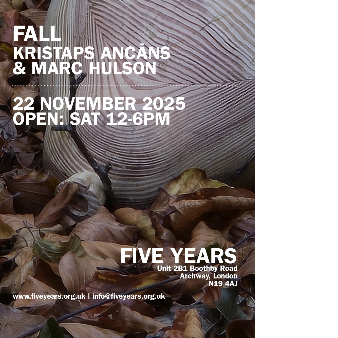 FALL is the latest in an iterative series of collaborative works by Kristaps Ancāns & Marc Hulson and follows recent exhibitions at BOTH Gallery (2024), The Good Rice and Domobaal (2025). Forthcoming exhibitions include Apiece Gallery (Vilnius) in 2026.