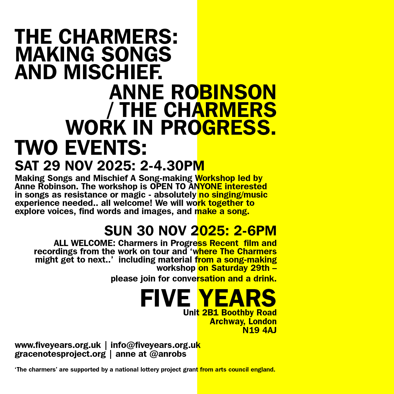 subscribe to mailing list | facebook | @fiveyearsarchway
